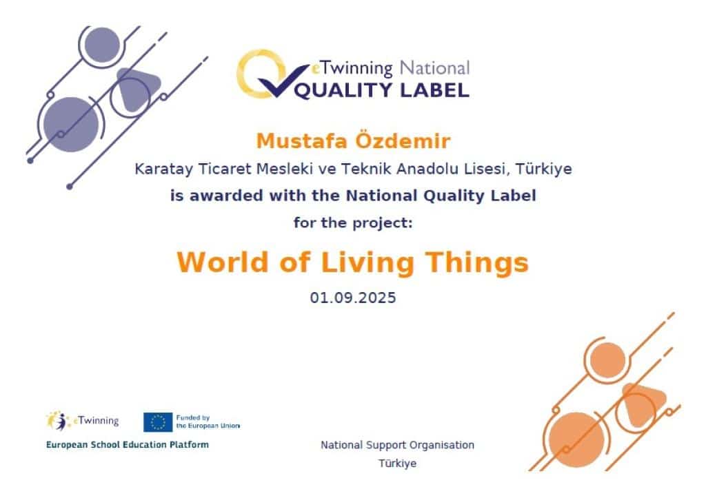 Okulumuzda Türkiye – Ürdün ortaklığıyla yürütülen “World of Living Things” (Canlıların Dünyası) isimli eTwinning projemiz, Ulusal Kalite Etiketi almaya hak kazanmıştır. Okul Psikolojik Danışmanımız Mustafa Özdemir rehberliğinde, öğrencilerimiz Kevser Kılıç, Münevver Saydam, M. Emin Çukurkavaklı ve M. Enes Ceran’ın katılımıyla gerçekleştirilen projede; öğrencilerimiz doğaya karşı duyarlılık kazanma, özgüven geliştirme ve topluluk önünde konuşma becerilerini güçlendirme fırsatı bulmuşlardır. Ayrıca farklı ülkelerden akranlarıyla iş birliği yaparak araştırma, üretme ve kültürlerarası etkileşim deneyimi yaşamışlardır.